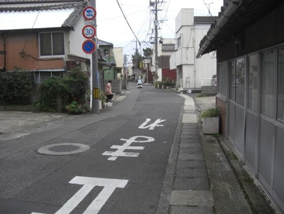 元の街道に戻り、注意しながら新道を横断して、細い路地を60m程進むと、T字路に出ますので、左に折れます