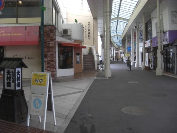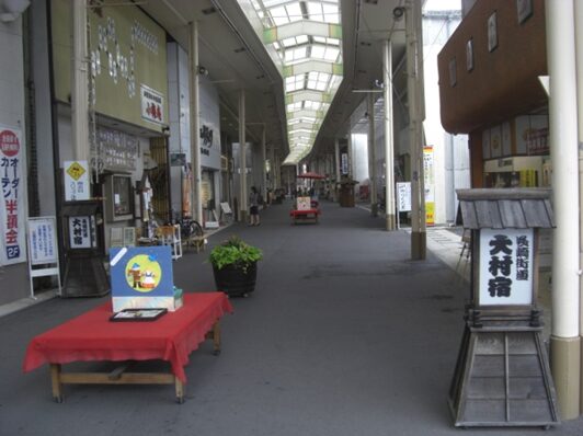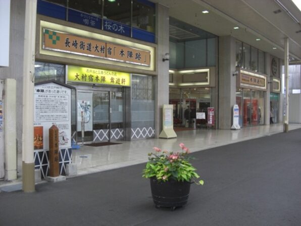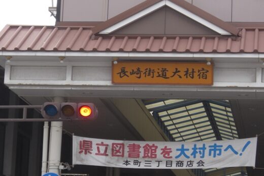 やがて信号交差点に出ます、正面の商店街の入り口アーケードに長崎街道大村宿の看板が架かっています、本町通り商店街に入ります。交差点を左に行くとJR大村駅
