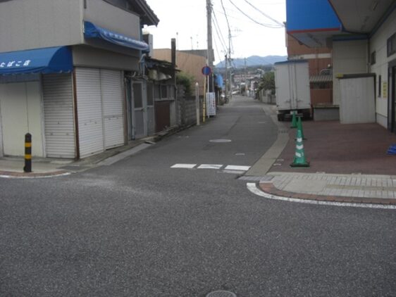 300m程真っ直ぐ進むと突当りを右直角に折れます