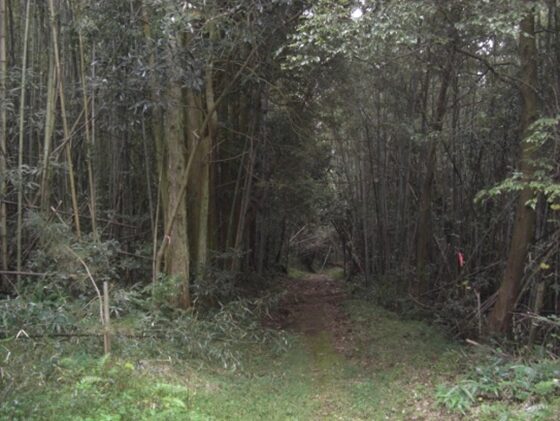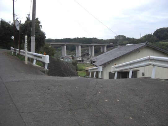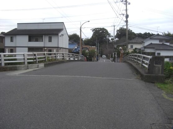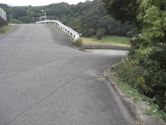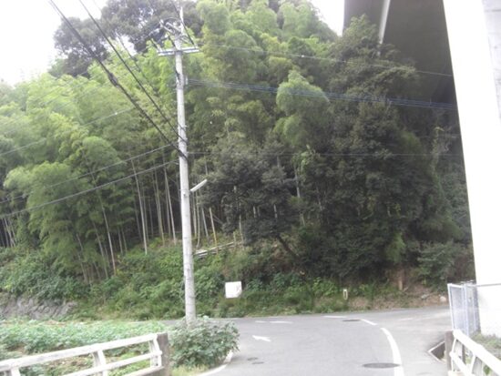 高速道の高架を潜らず、右に折れて小さな川橋を渡る。渡ったところから振り返ると、消失した旧道は向かって真直ぐの竹林でその先が墓地の様です。完全になくなっています