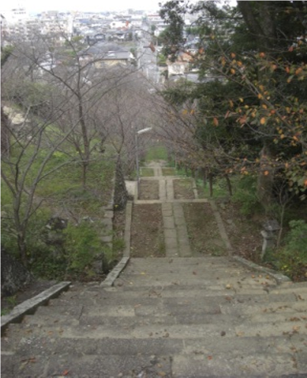右斜めの道を迂回します、迂回道を80m程進むと、ながさき看護センタ―に突き当るので、左に数十m折れます。正面に上田ハイツがある前の道を右に折れて、右にながさき看護センターや長崎県央看護学校・永昌町公民館を右に見ながら120m程進みます。永昌町公民館の東側で広くなった変則な辻を左に十m程折れて、美匠堂表具店の手前の道を右に折れると旧道の復活です。