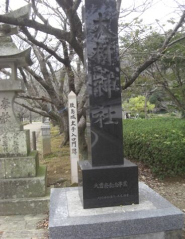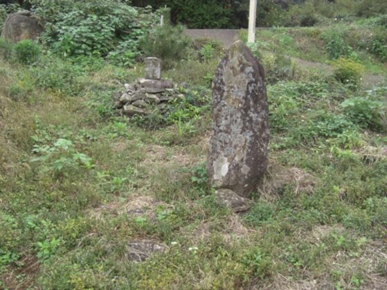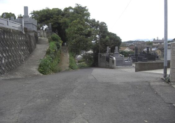 交差する手前左角に大村純忠の家臣 渡辺傳弥九の墓(奥)天正時代に従者とともに大雪で遭難したといわれている。手前にも従者の墓石か