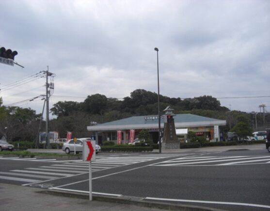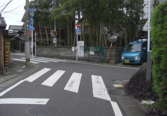 右に折れたやや広い道を南西に300m程進むと信号交差点に出ます