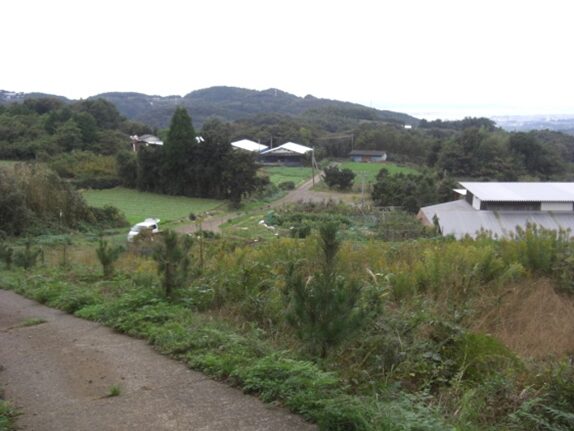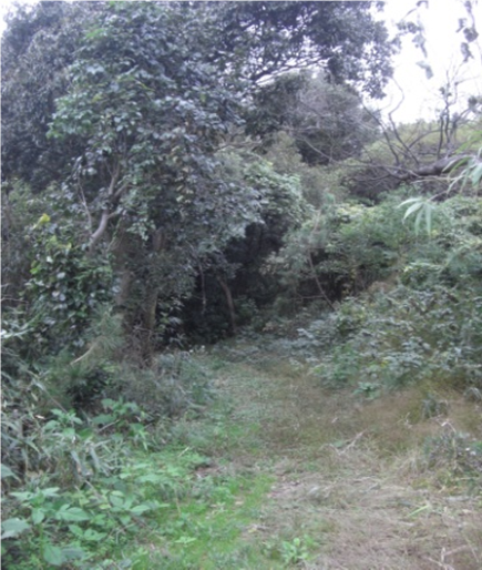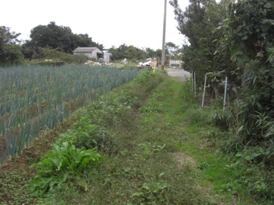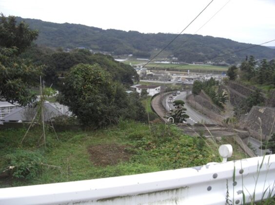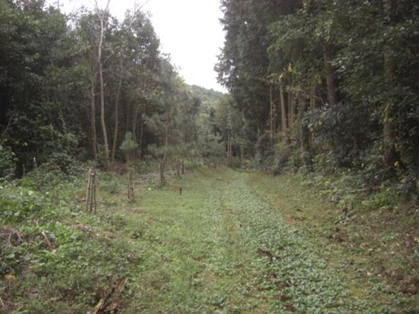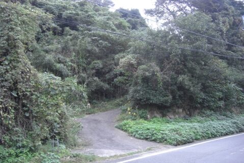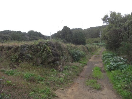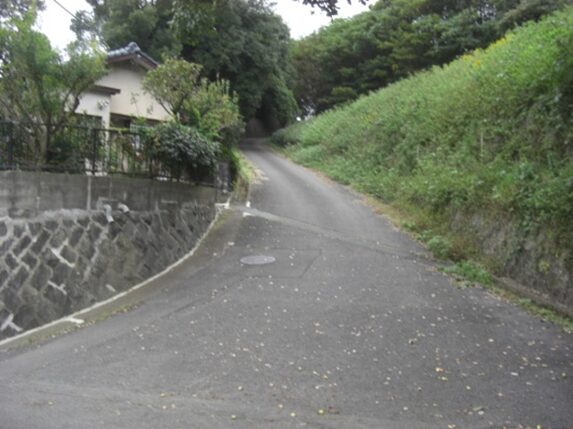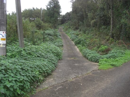左の墓地で消えた旧道を想像しながら進んでいくと、高速道の手前で、左から下ってくる道があります。おそらくここに出てきていたのだろう。(振り返り写したところ)