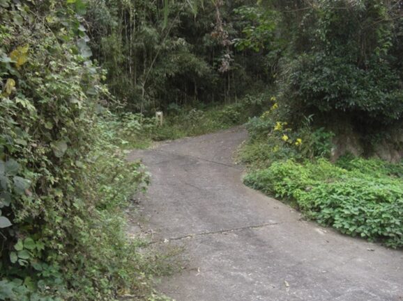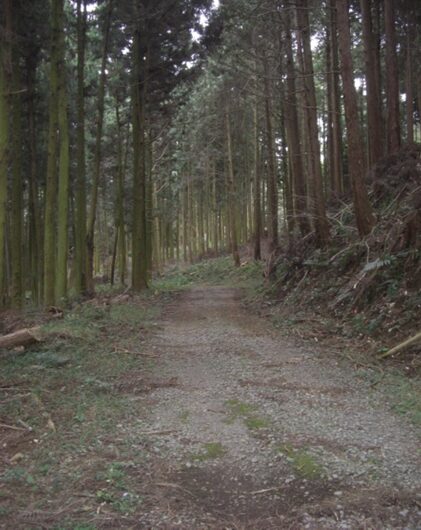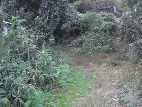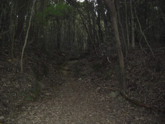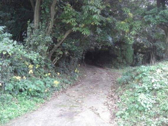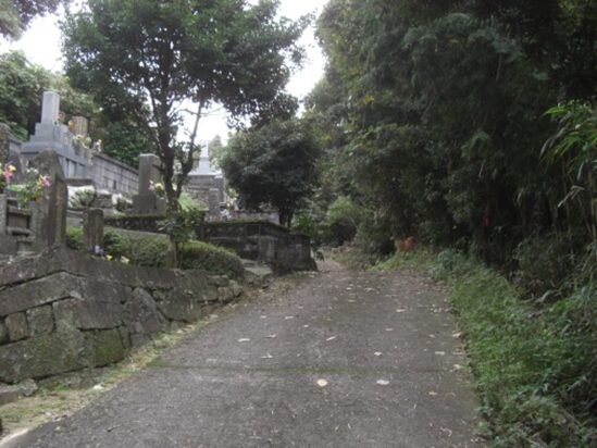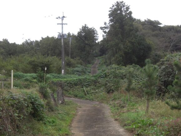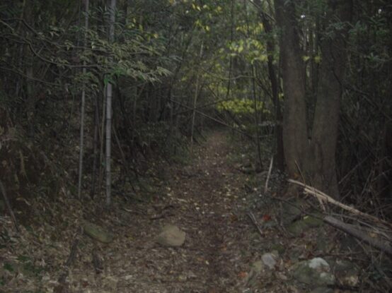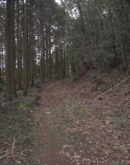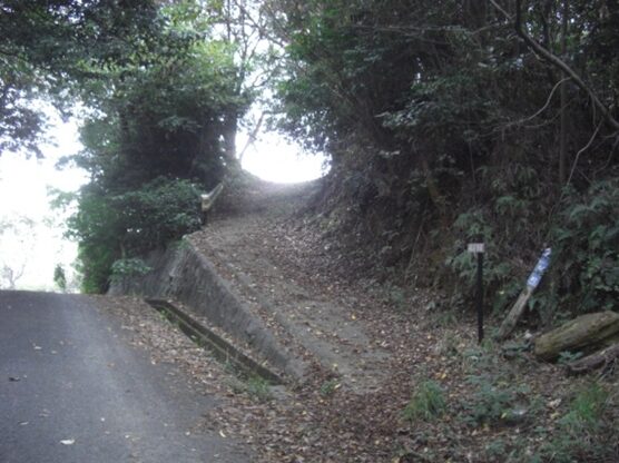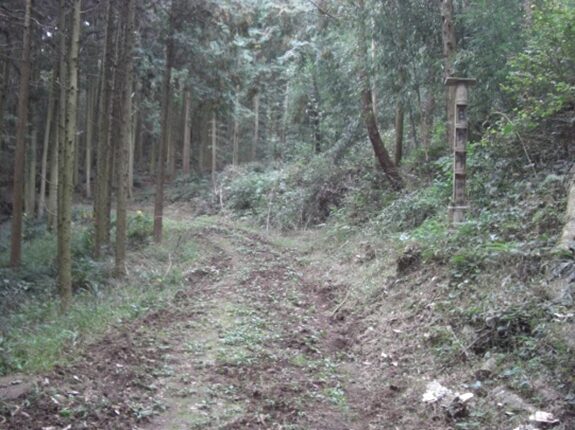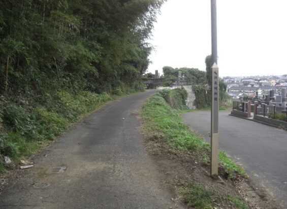 渡辺傳弥九の墓のすぐ背後に見える交差する分岐、真っ直ぐ左側が街道で100m程登ると