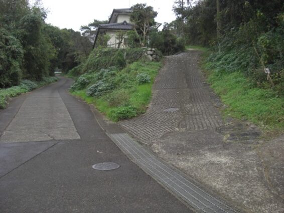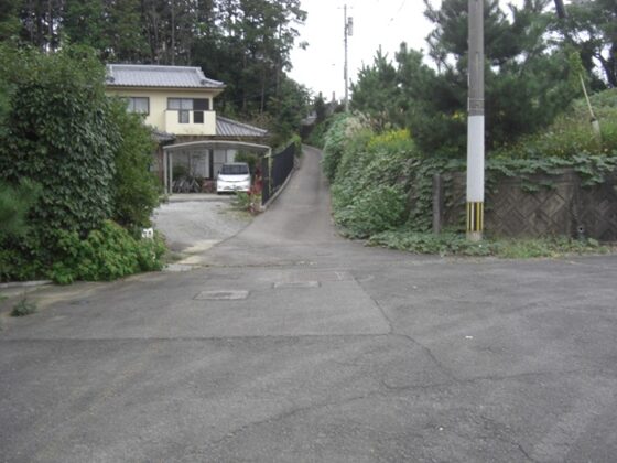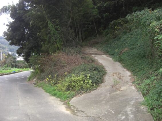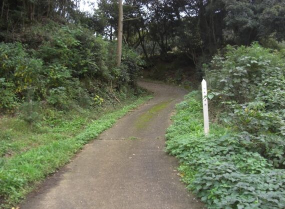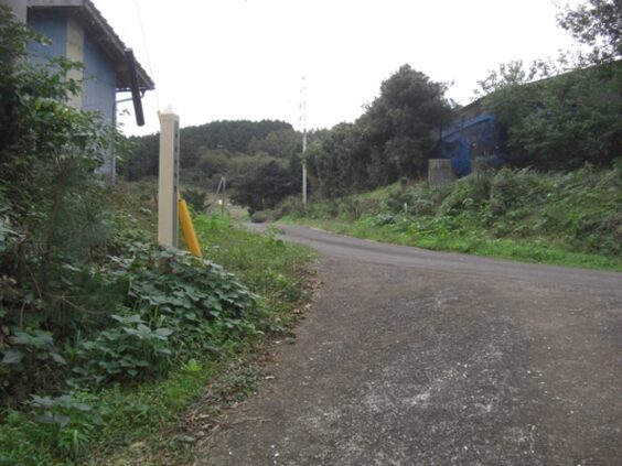 右に入った分岐より集落内を350m程進んでいくと、右に上がる分岐があるので右側へ、左の道は先で右に急カーブでUターンして、右側を登った道と交差します。