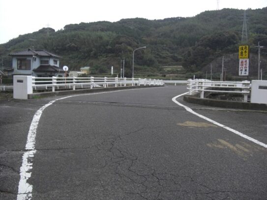 鈴田小学校のすぐ先で変則四差路があります。真っ直ぐの道が 天保以降の街道で、それ以前は右斜めの道です。角に案内標示が立っています。真っ直ぐ200m程進みますと鈴田川に突当り南に方向を変えた先で、右斜めの旧道と合流します。