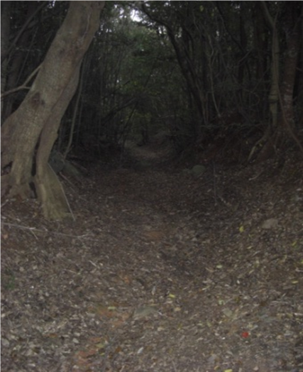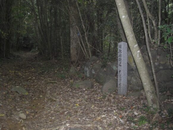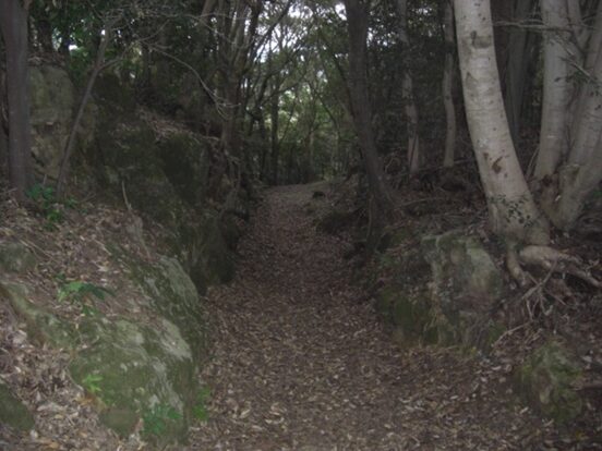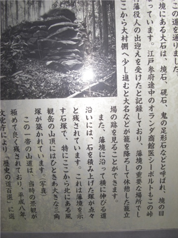 境にある大石は、境石・硯石・鬼の足形石と呼ばれ、境の目印となっていました。また、藩境に沿って横に延びる道沿いには、石を積み上げた塚が点々と残されています。これは藩境を示す石塚で、ここから北にある風観岳(標高236.2m)の山頂にはひときわ大きい三角塚が築かれています。(写真)この一帯の旧道は、当時の景観が極めて良く残されていて、平成八年、「歴史の道百選」に選ばれています