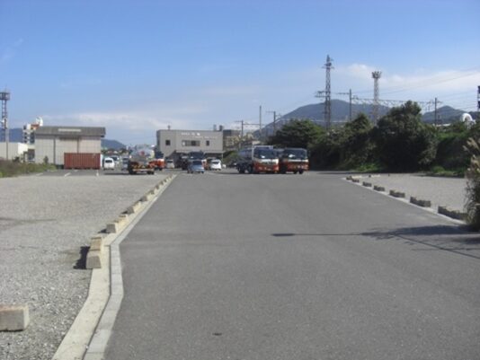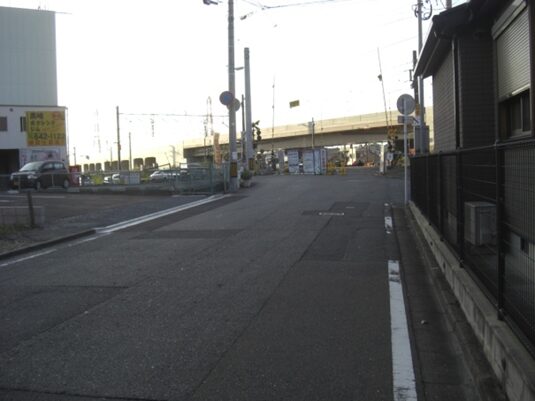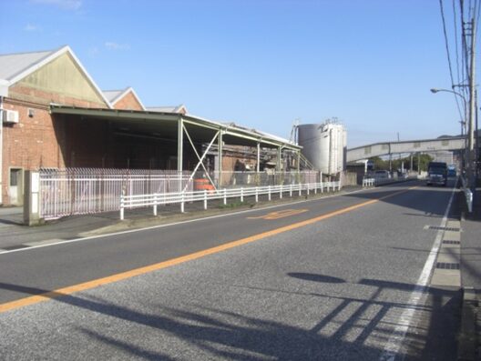 小森江駅から駅の海(西)側の199号線を少し南に進み振り返ったところで、筑後久留米藩屋敷跡です。小森江・門司港方向を見たところです。工場が立ち並んでいますこの先旧道は失われているので、小森江駅の西側(海側)の199号線南に300m程歩くと大里本町一丁目信号交差点にでます。信号のすぐ東の筋から旧道を進みます