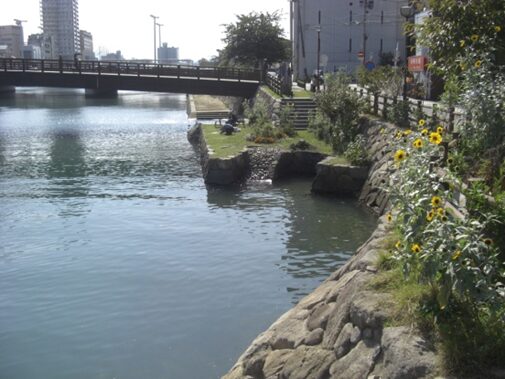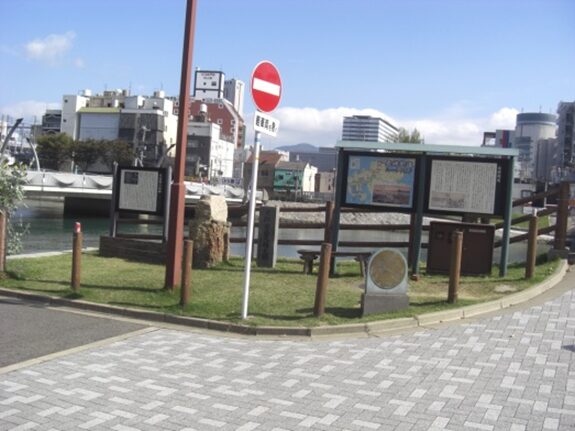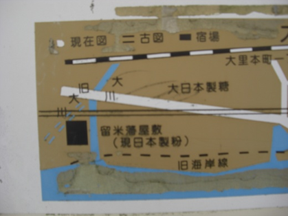 宿場の東を流れる大川の川口に久留米藩の屋敷が江戸時代末まであった。この屋敷は小倉藩から船入地として借り入れていたものです。(説明板より)