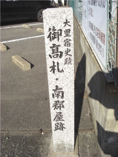 この地に御高札と南郡屋が建っていた、高札場は幕府及び藩の通達を掲示したところで、隣接の南郡屋は藩役人が各村庄屋へ通達と打ち合わせを行ったところ