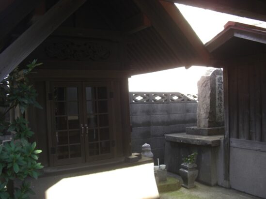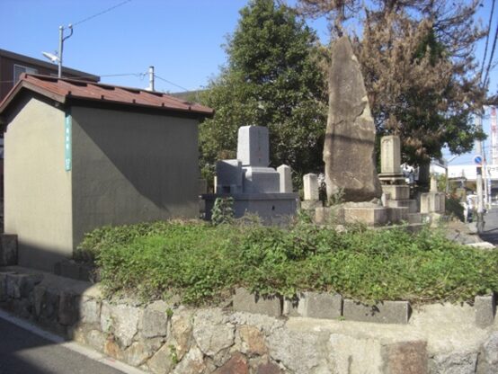 寛永15年(1638)には、島原の乱の戦功により禄高2千5百石から4千石に更に高禄となり、承応3年(1654)には養父武蔵の頌徳碑を手向山に建立しています。延宝6年(1678)67歳で亡くなる。宮本家の墓は、もと山上の手向山公園の武蔵の碑の傍にあったが、明治20年(1887)に陸軍の砲台が構築されたとき現在地に移転した。伊織の墓は墓地の奥にあり、「忠厳紹徳居士覚霊」と刻まれている。