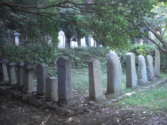 宮本伊織家代々の墓所。白い4基の墓が見えますが、手前から2つ目が 宮本伊織の墓