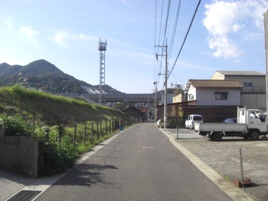 高架を抜けて50m程進んだ右手に入る道の正面の山が黒崎城跡の道伯山(標高63m)が見えます