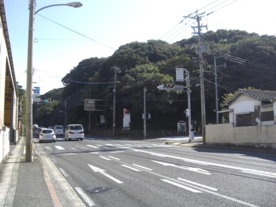 信号交差点からさらに220m程先で左からの国道3号線に合流します。この先旧道は真っ直ぐ進んでいたが建物で消失しているので迂回します。3号線を右に150m程進みの真鶴二信号交差点にでて左に折れます、左角に福岡トヨタがあります、100m程進んだ二筋目の十字路に出たところが、旧道の復活地点です