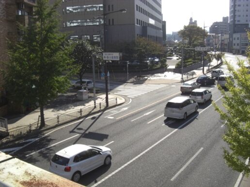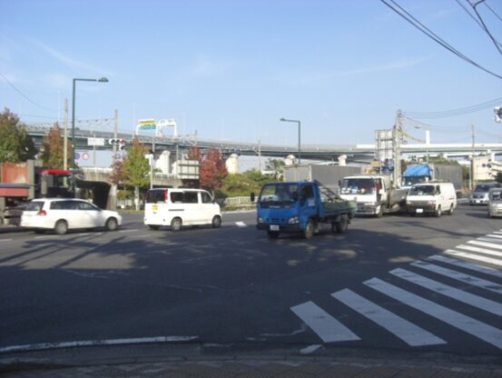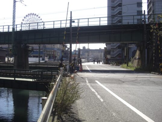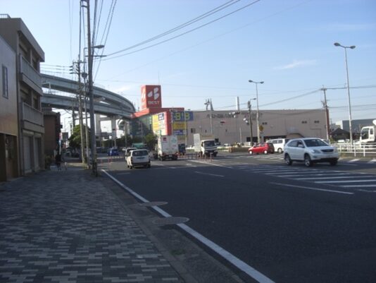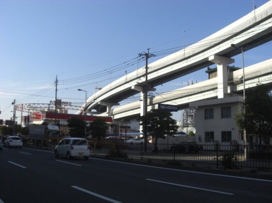 5号線の高架を右上に見ながら少し3号線を西本町一信号交差点まで歩きます。高架の右側にはスペースワールドがあります