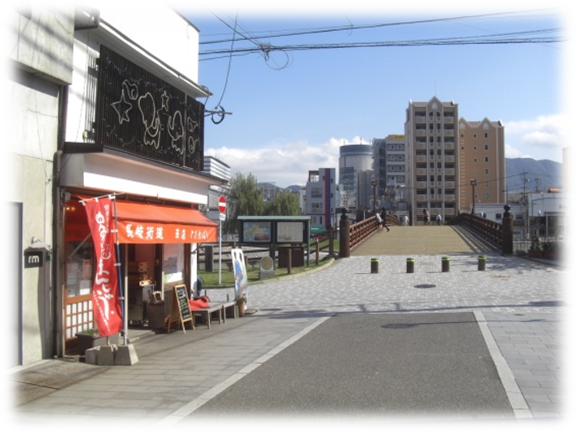 左に折れて150m程進むと信号交差点を横断、左角にセブンイレブンがあります、その先で、槻田川に架かる茶屋川橋を渡り茶屋町に入ります
