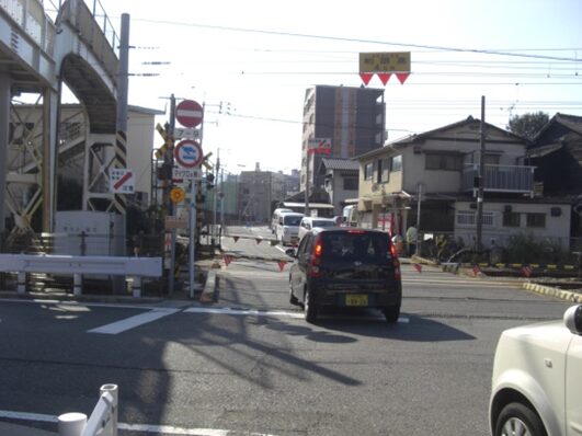 かつての旧道は3号線の北側に出て、正面右に見えるベスト電器との間辺りを抜けて5号線の高架下を進み西へ、春の町団地を通って高架下より3号線の西本町一信号交差点に出ていたようです。春の団地のところで一部新道はあるようですが旧道は消失しています