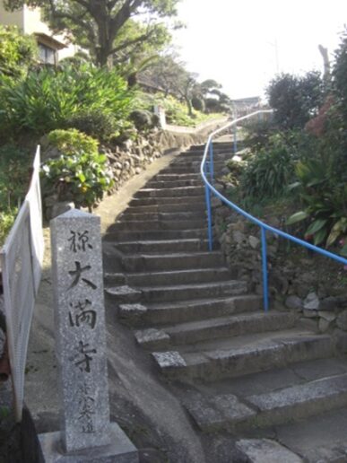 法輪寺の前から100m程進むと変則の信号交差点に出ます、道なりに右(西)に進むと、左に石段の参道があります高台には 曹洞宗大満寺 があります。