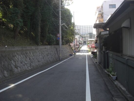 参道のすぐ先で道が分岐しています、真っ直ぐ下る道と、右に坂を上る道が分かれます。旧街道は右の坂を上る道です。大蔵1丁目地区です。150m程坂を上り左にカーブしながら150m程坂を下ります。