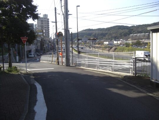 善龍寺のすぐ先で信号交差点を横断します、その先左に篠崎中学校を見て400m程進みますと、日豊本線の踏切に出ます